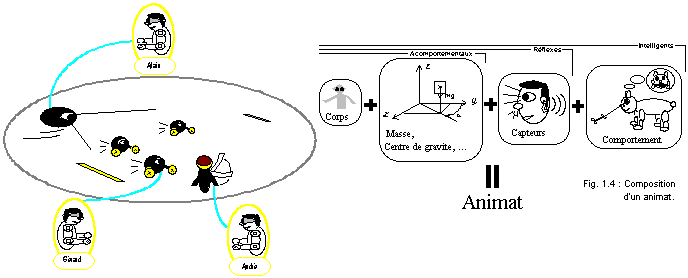 « Étude et intégration d'un système multi-utilisateurs dans la simulation comportementale » Ce sujet a donné lieu à une réalisation sous IRIX avec deux exemples : des robots bâtisseurs participant ensemble à la construction d'un mur, et une course virtuelle illustrée ci-dessous.